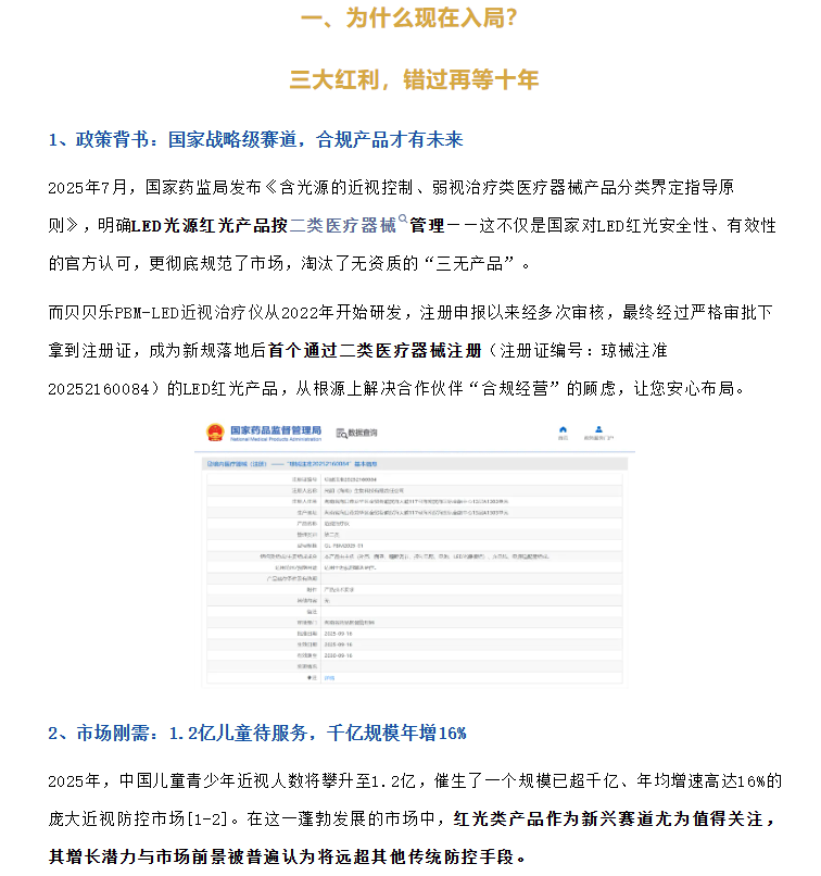 2025年国家红光新规落地后的“第一证”持有者——贝贝乐PBM-LED近视治疗仪,正式开启全国招商,邀您携手抢占视光行业黄金风口!